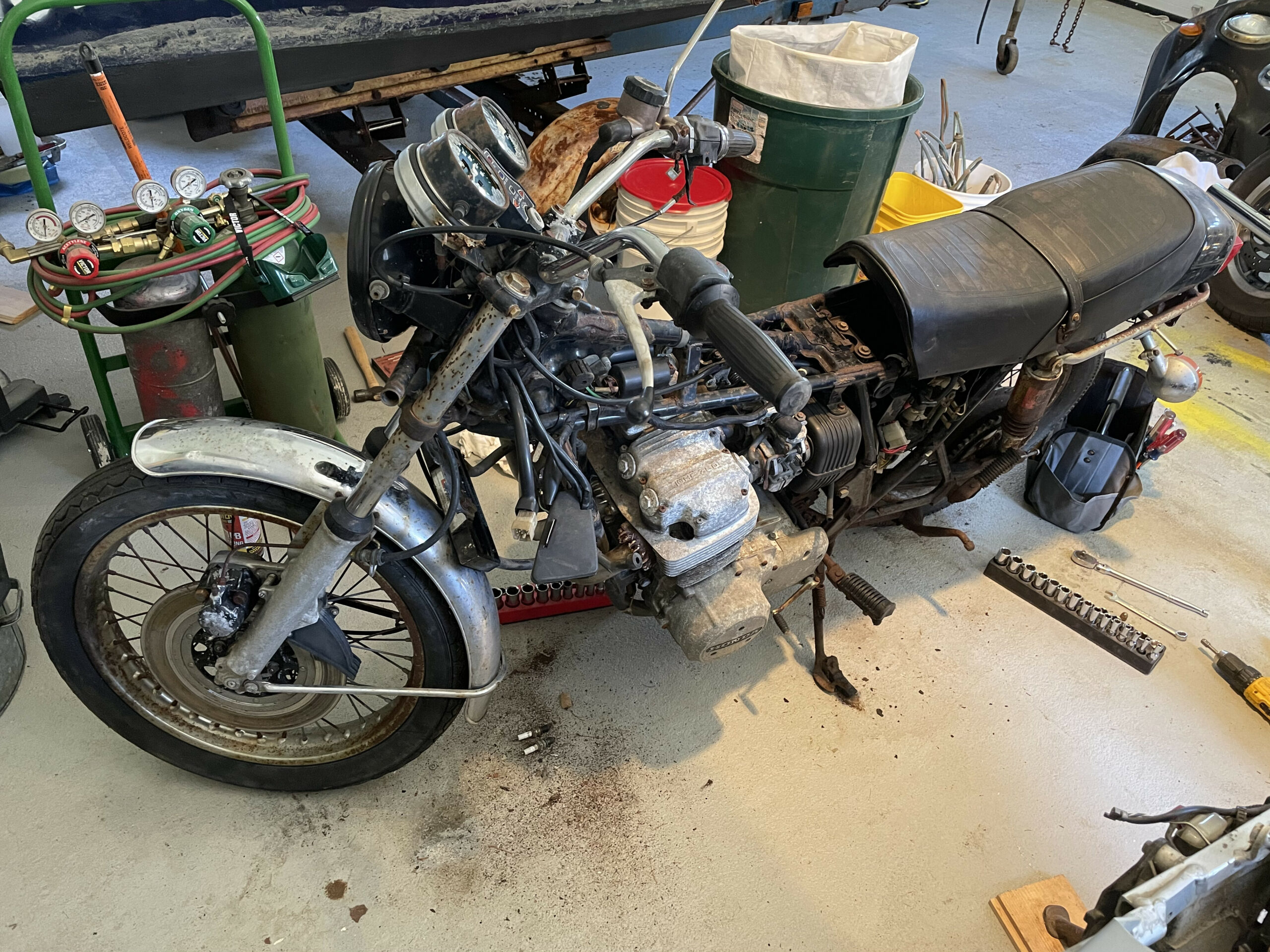I was aware of an old motorcycle located on Firehouse Road, Chebeague Island and was curious if the owner would give it to me for the purpose of restoration. He had plans to restore it but this never came to fruition. I tracked him down and asked if I could have it- to my surprise he said yes! On April 21, 2021, I pulled the motorcycle from the woods, a dilapidated 1975 Honda CB750F Super Sport, moved it to a garage workspace and began what would be a two year restoration.