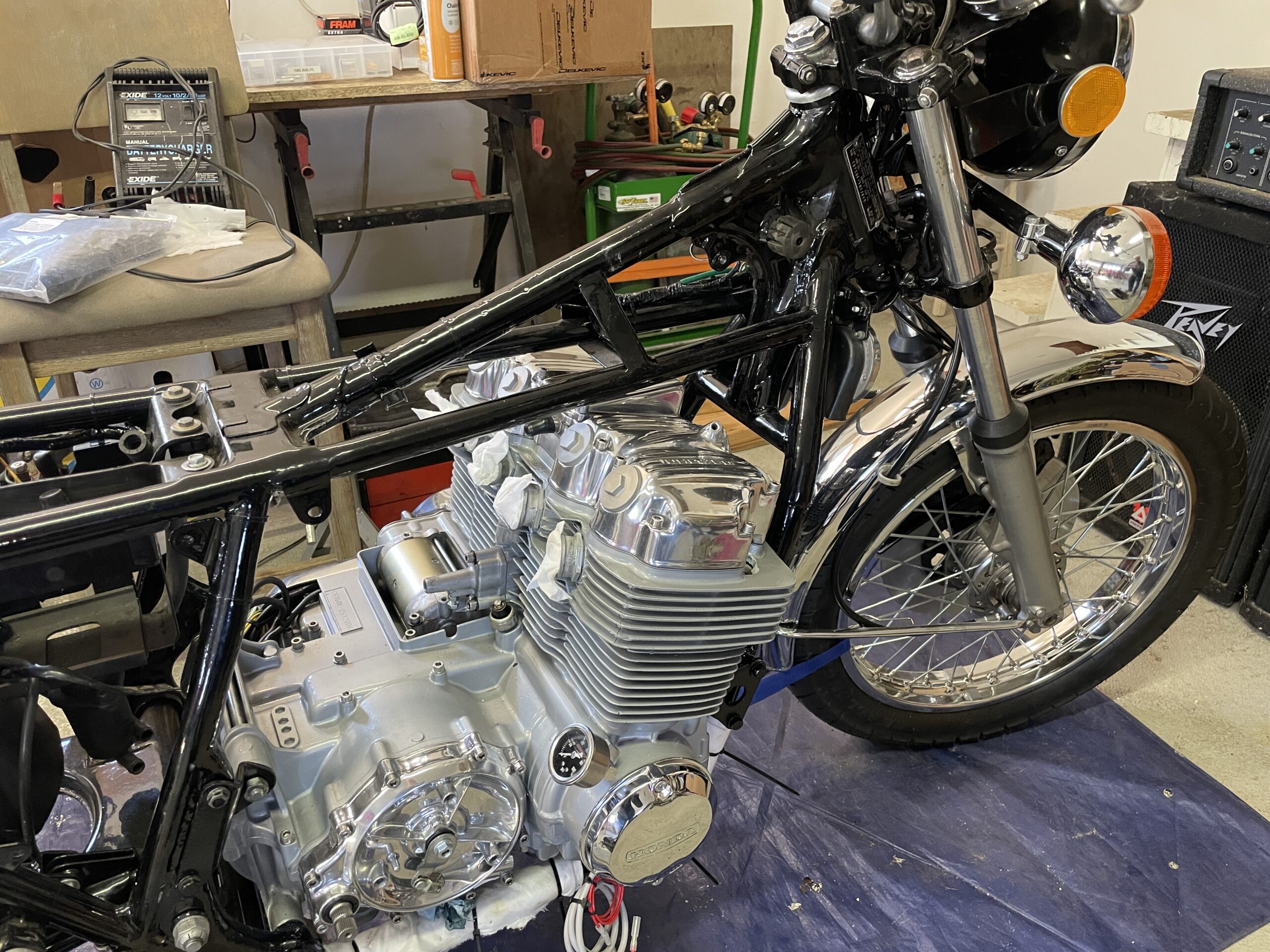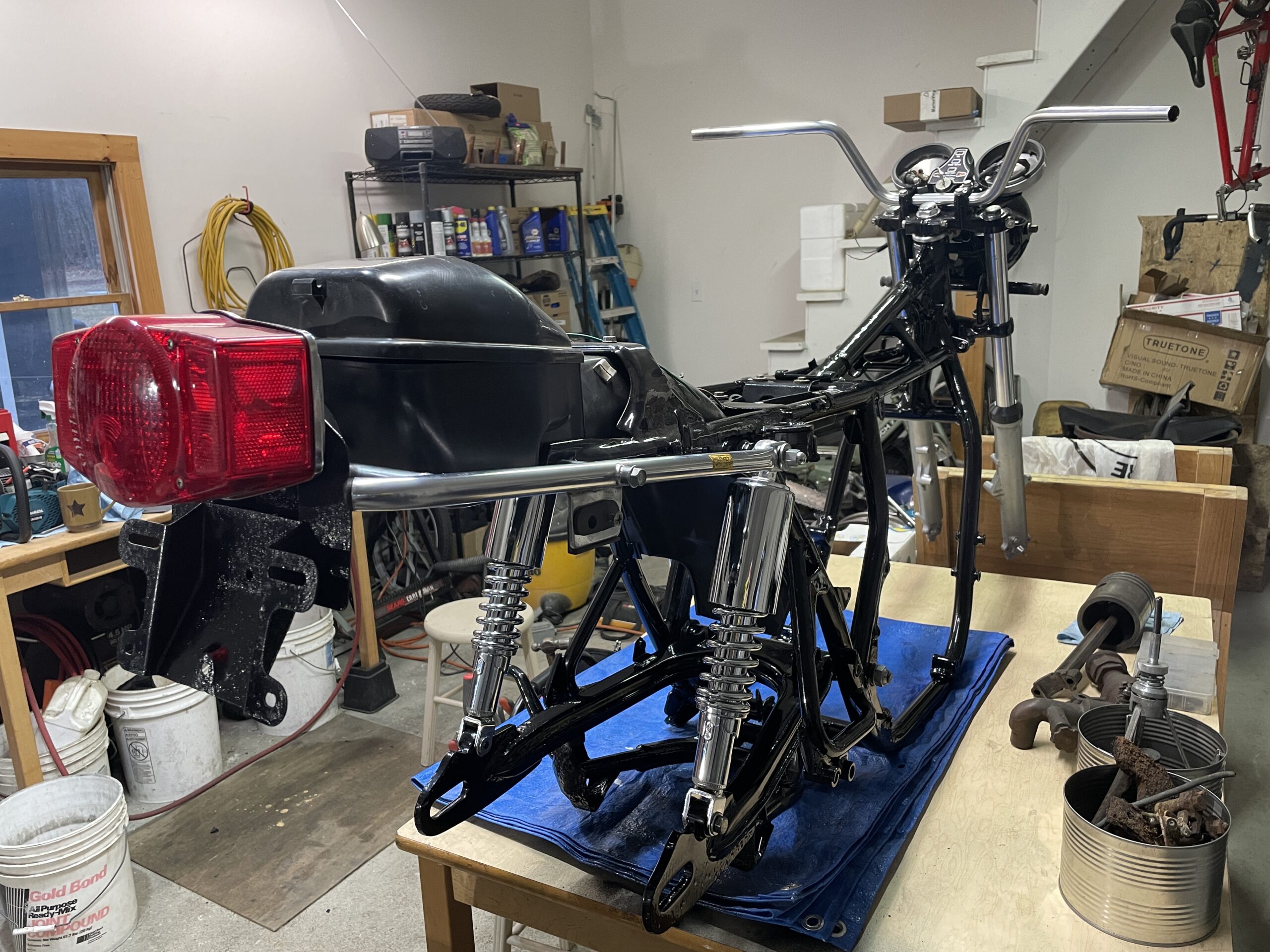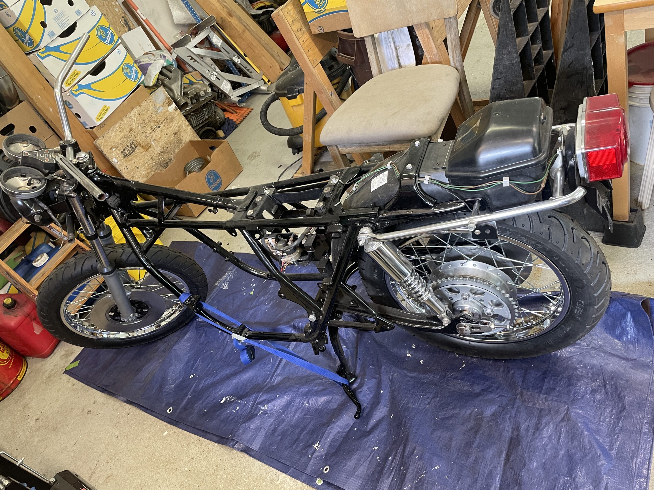 A rolling chassis is a motorcycle or car that has been assembled to the point where it can be rolled around on its own wheels and suspension. It typically does not have the engine installed and most systems are working. Thus was the case here: everything was installed and working except the engine. It was exhilarating to see the motorcycle reassembled to this point and gave me a lot of motivation to keep pushing forward.