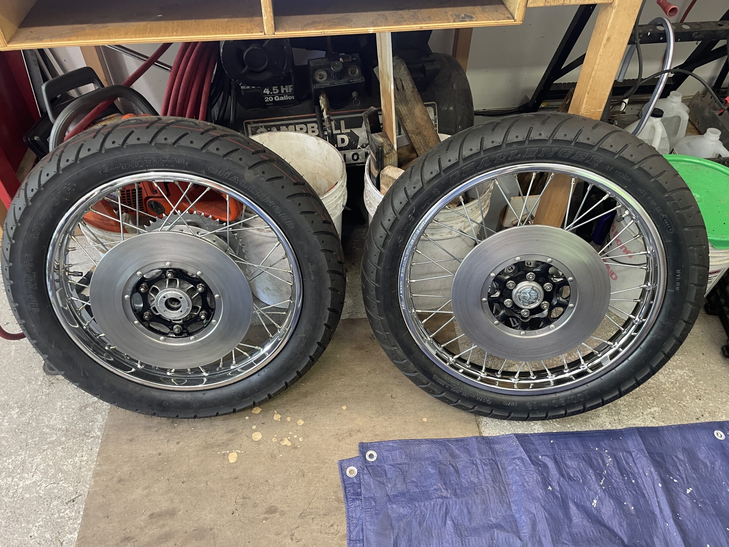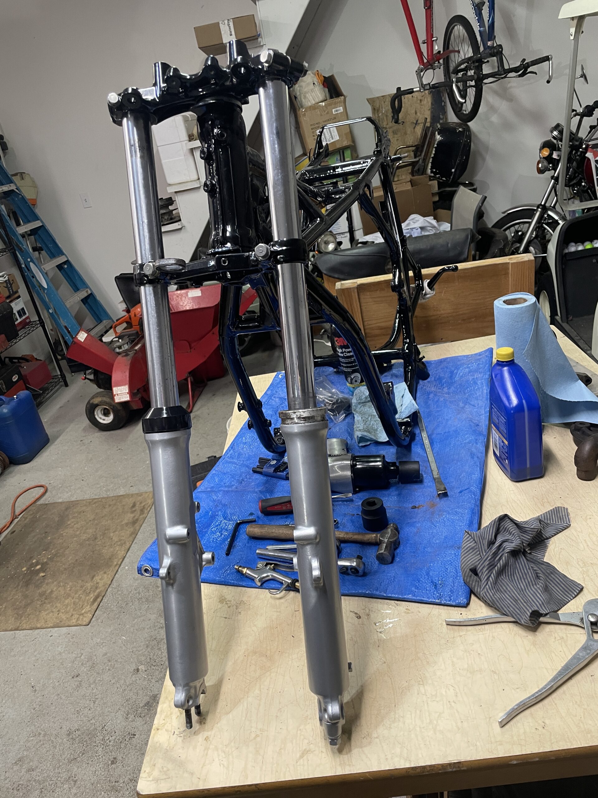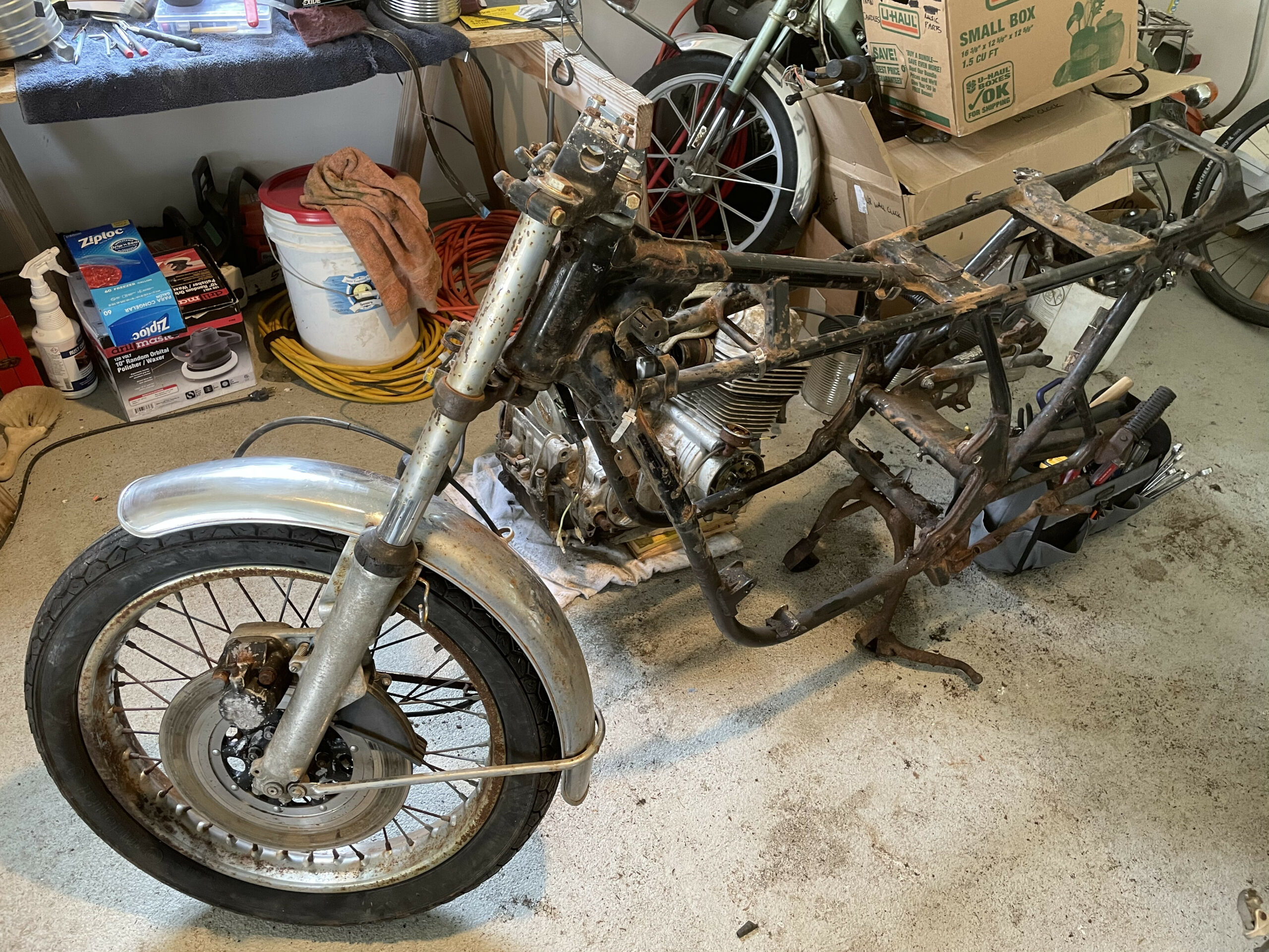 A rolling chassis is a motorcycle or car that has been assembled to the point where it can be rolled around on its own wheels and suspension. It typically does not have the engine installed and most systems are working. Thus was the case here: everything was installed and working except the engine. It was exhilarating to see the motorcycle reassembled to this point and gave me a lot of motivation to keep pushing forward.