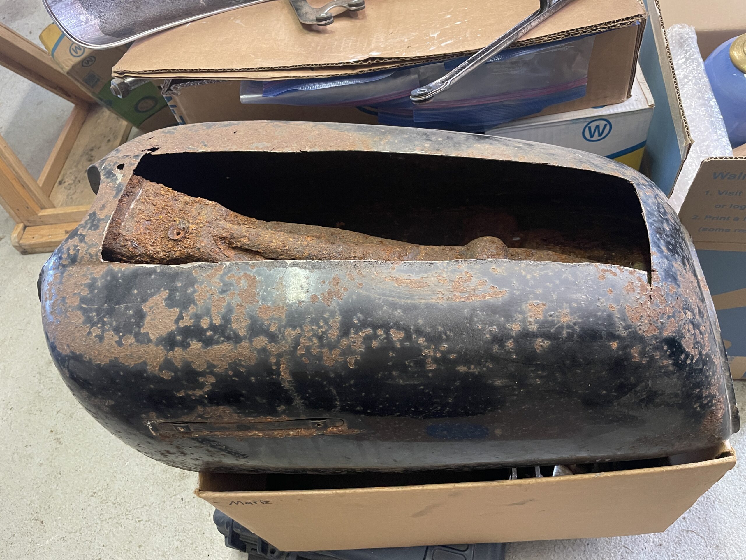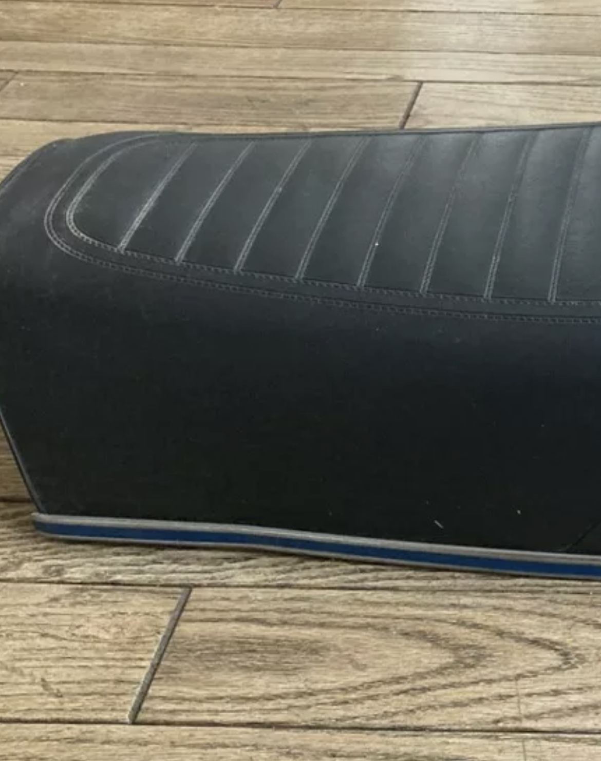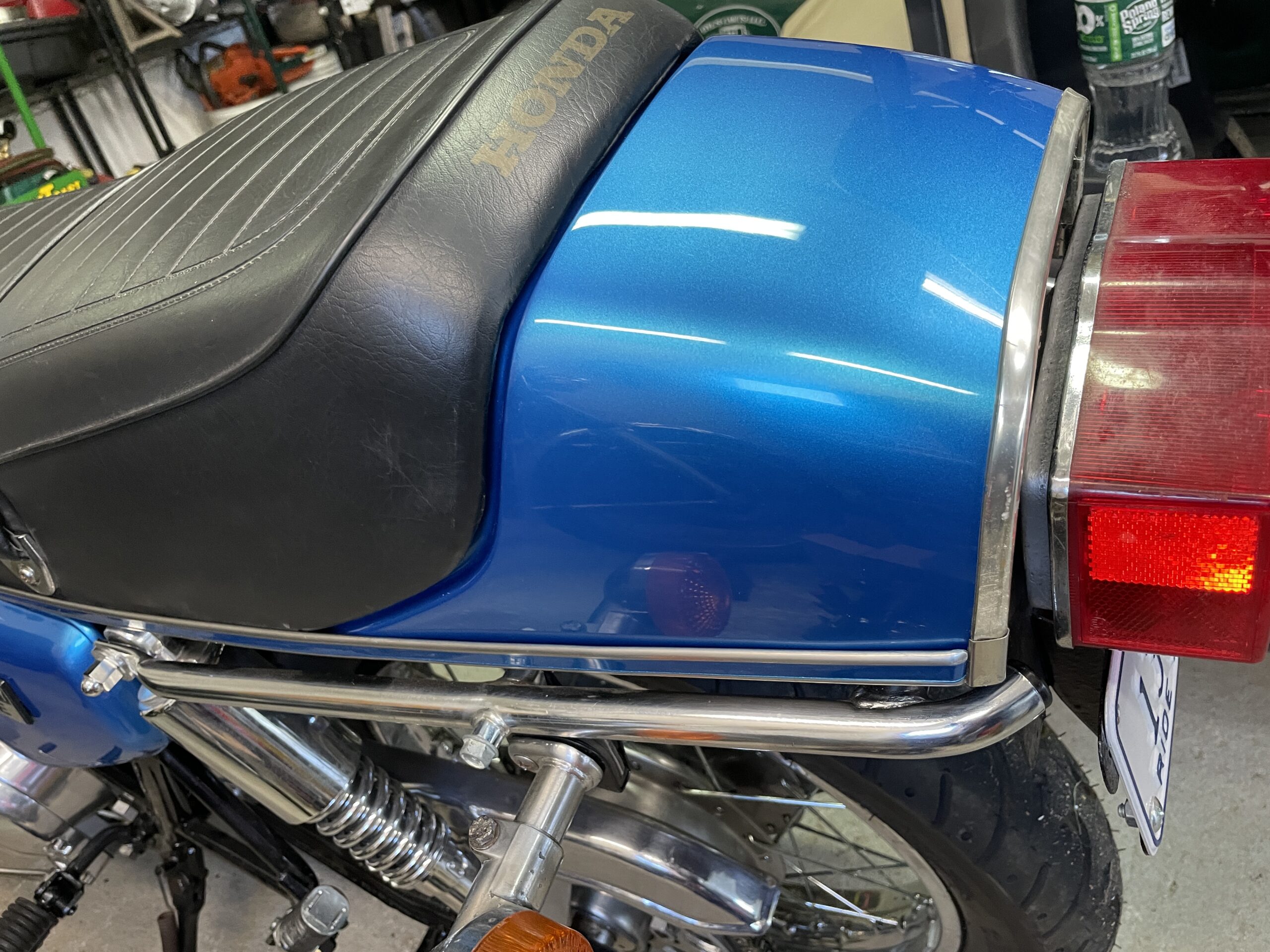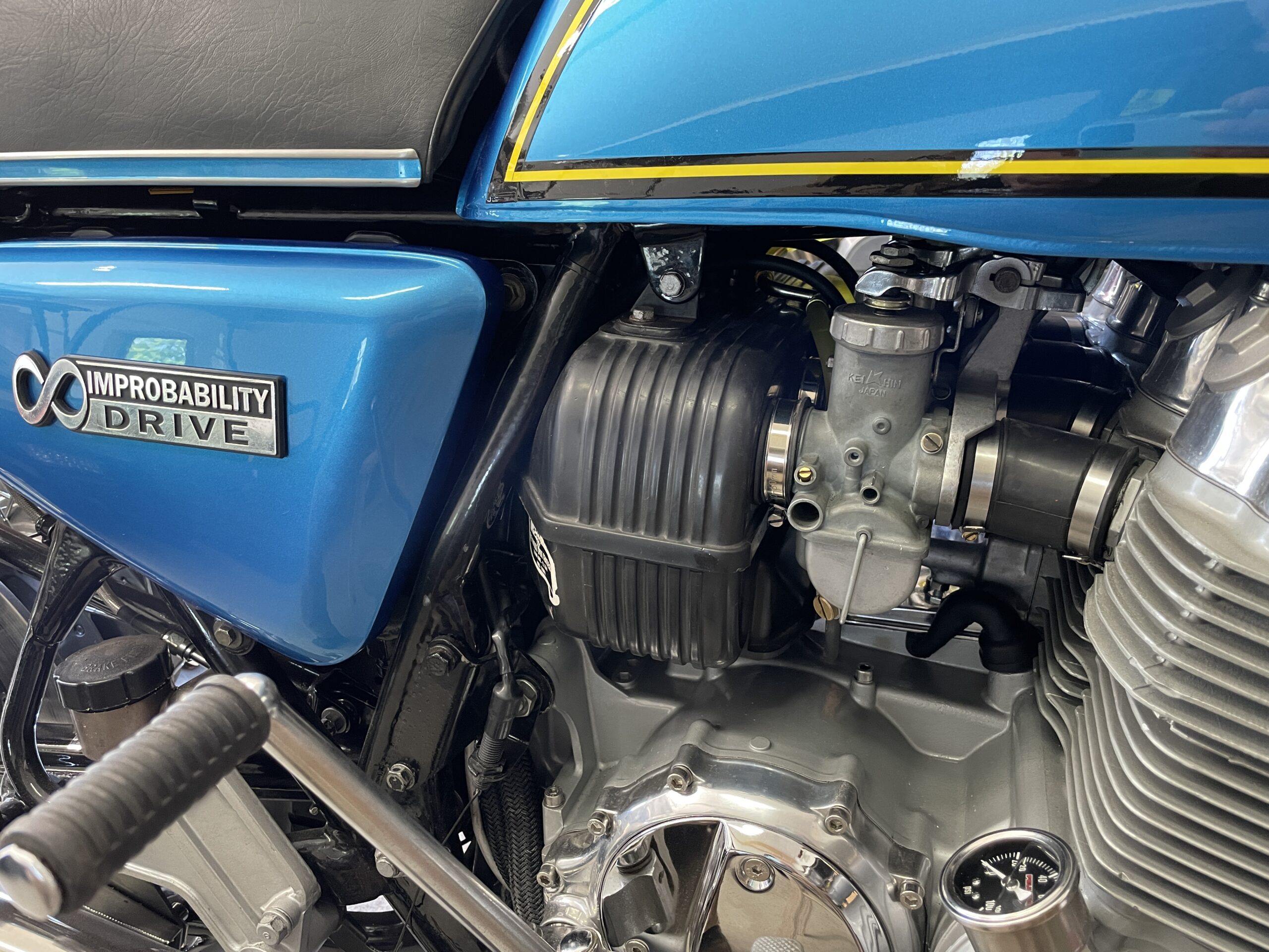 The body work involved the acquisition of rare and difficult to find parts such as a suitable gas tank and seat trim. Jokingly, restorers sometimes refer to these hard to find items as “unobtanium”. Fortunately, I was able to find good used parts which had the potential to be correctly restored. I sent out the fuel tank to be repaired and lined by Moyer Fuel Tanks http://www.gas-tank.com . These old gas tanks are susceptible to deterioration and leaks, particularly above the engine exhaust. I discovered this while riding with an unrestored tank that started dripping fuel on the exhaust. I am not sure why it never caught fire but needed to permanently eliminate this as a possibility. Moyer’s completely stripped, sand blasted (inside and out), metal worked, sealed and primed the tank. It came out well and was ready to be body worked and painted. I also partially restored the seat trim and had this and the body work professionally done through the good folks at Phoenix Cycles in Westbrook, ME https://www.phoenixcycleshop.com/ . The tank and body parts turned out great and I had the seat trim painted to match the tank. The original seat trim came with decals so I considered this a worthwhile upgrade. Instead of the 750-Four emblem, I decided to install a custom emblem on the side covers which reads “Improbability Drive”. This is both a reference to “The Hitchhiker’s Guide To The Galaxy” book and the improbability that this bike would have ever been restored. Perfect!