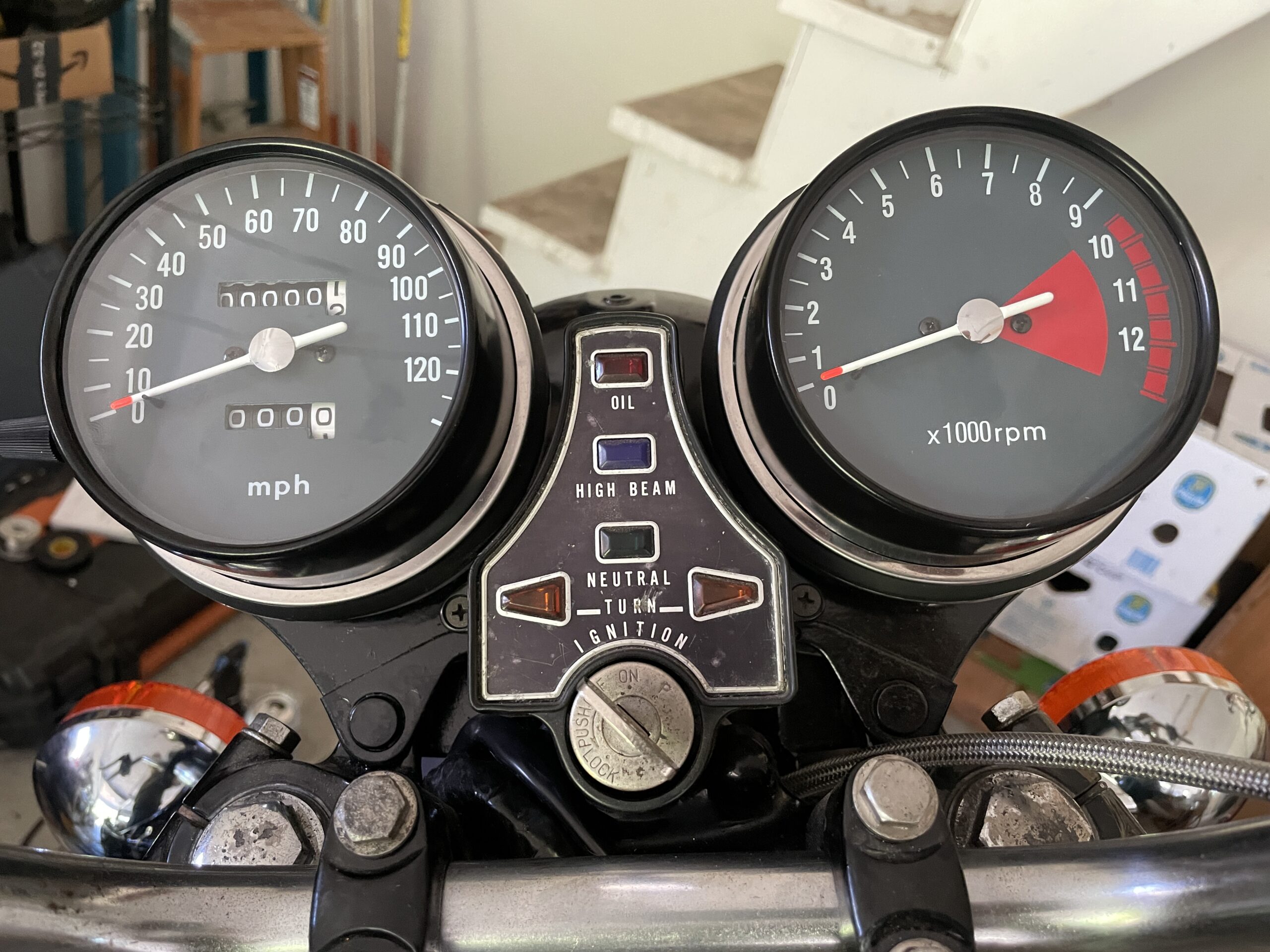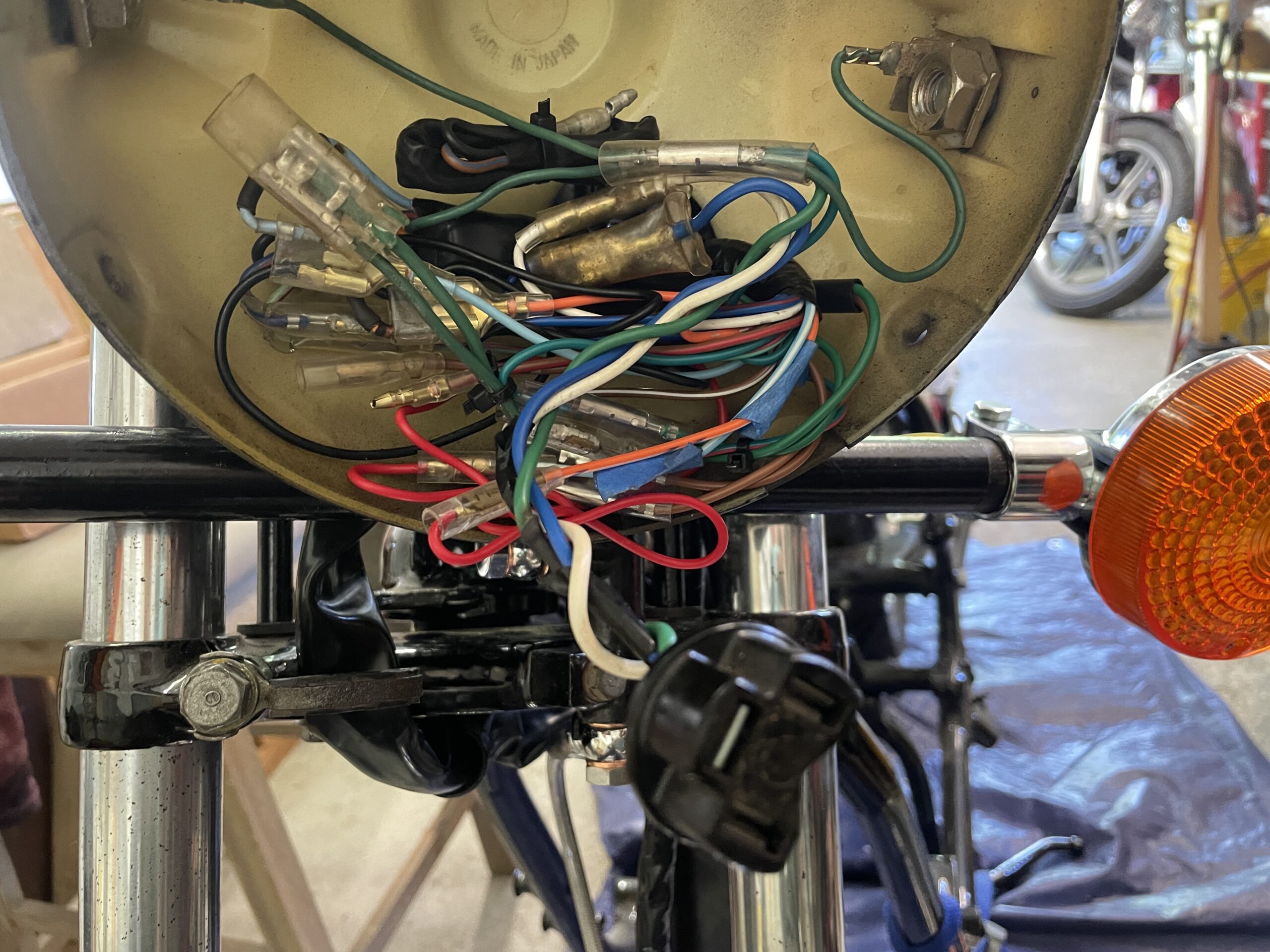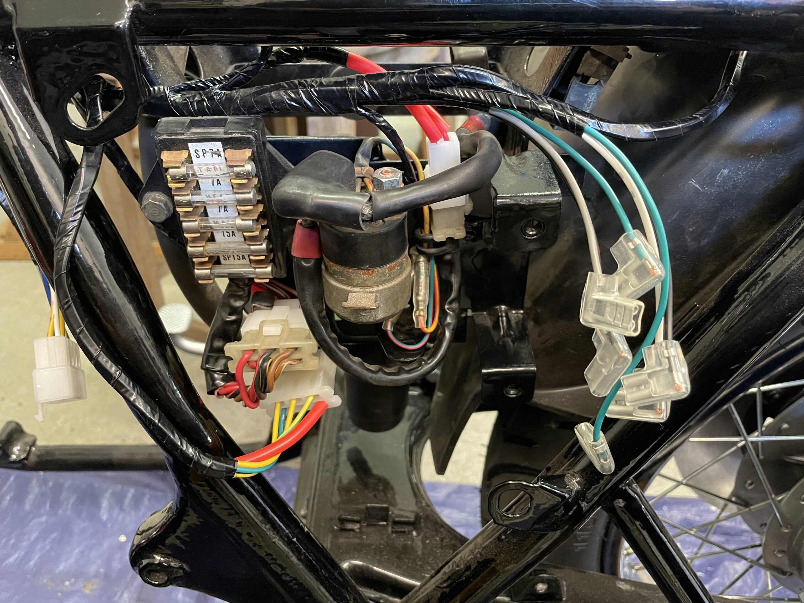 The wiring was old and brittle, thus it had to be entirely replaced. Fortunately, good reproduction wiring harnesses are available. I purchased one, rewired the bike and checked all available systems for proper operation. The control switches on the handlebars also had to be replaced, routing the wires through an original and correct handlebar. One hiccup in the process was when I discovered that the charging system would not work. I tracked this down to an improperly assembled harness connector where two of the wiring pins were swapped from their proper location. I fixed that and the system charged properly. I also installed LED lamps in all locations for safety.